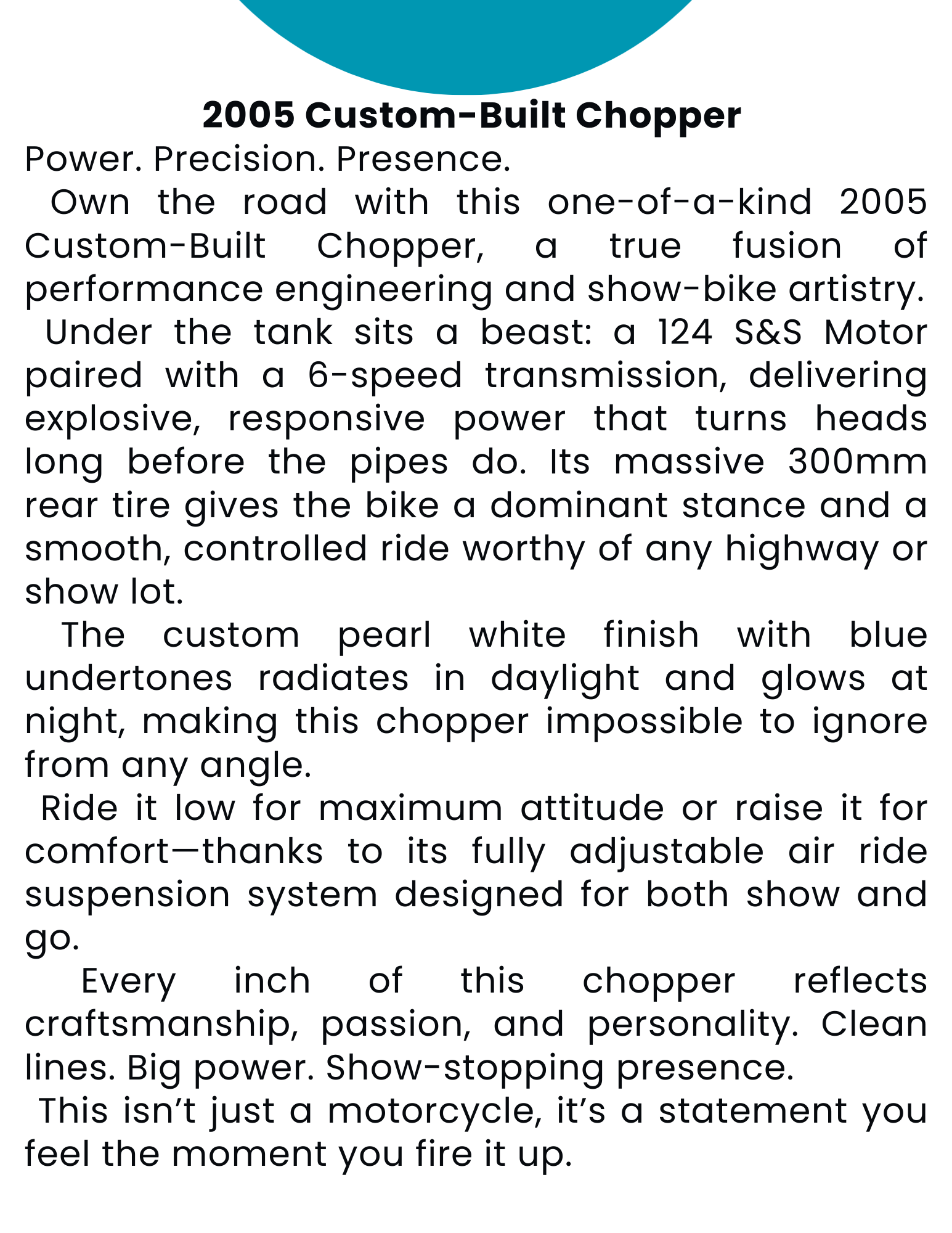 A show-stopping, one-of-a-kind custom bike. Chrome, attitude, and soul.
